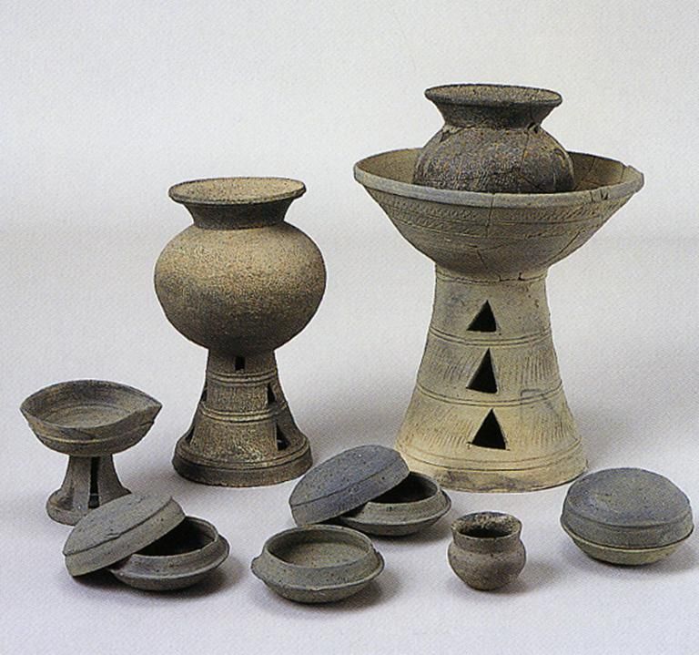 古坟时期另一种陶器为须惠器(图十二),比土师器精美。它在古坟时代中期才从大陆引进而来,由朝鲜半岛的“陶部”工人在相对集中的场所制作,采用轮制技术,器物呈青灰色,器形富于变化,主要为壶、瓶、盘、碗和高脚杯等。