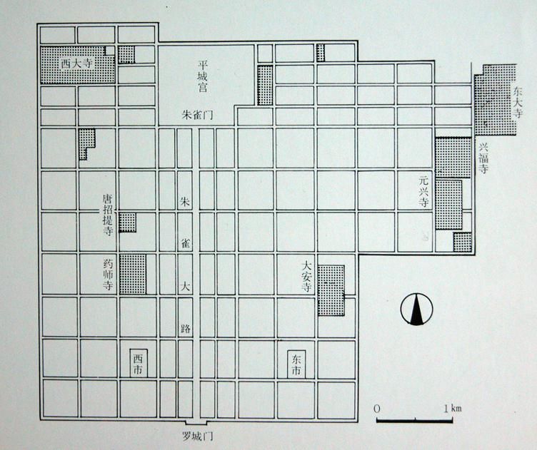 平城京在规模上继承了藤原京,面积大致相同,东西约5.9km、南北约4.8km,其形制主要模仿唐长安城。全城平而呈长方形,宫城在北部中央。南面正中设象征性的都城正门——罗城门。罗城门与宫城的朱雀门相对,朱雀大路纵贯南北,全长约3.8km,宽72m。而此朱雀大路正好将全城分为东西两部分,分别称左京和右京。京城内有里坊与商市(即东市和西市)。这些设置和街道的名称都和唐长安一模一样,但总体面积仅为唐长安城的四分之一(图二十一)。