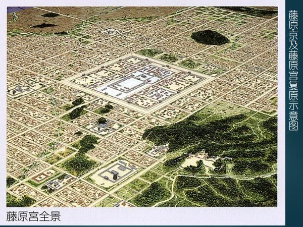 飞鸟-奈良时代对作为中央集权国家的象征的都城建设,极其重视。藤原京是持统、元明、元正三代天皇延用了16年的都城遗址,这个遗址经过几十年的考古发掘,已经探明了藤原京和藤原宫的范围及布局(图二十)。京城东西及南北各长5.3km,平面近正方形,宫城在其中央,这点与唐长安城不同。有学者认为,藤原京是以《周礼》规定的理想化都城建制为依据所筑成的。