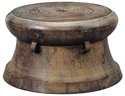 在鼓面和鼓身上,装饰着翔鹭纹、划船纹和羽人舞蹈纹,表现龙舟竞渡和化装成鹭鸟的舞人翩翩起舞的场景,留下了难得的民族风情图景。