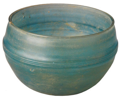 玻璃杯的腹部装饰了三道弦纹,经轧膜成型、精细抛光后,呈半透明的浅蓝色。经检测,此杯属于钾硅酸盐玻璃系统,这是印度、东南亚以及我国华南和西南等地特有的一种玻璃系统,杯身凸弦纹纹饰在我国先秦和两广出土的汉代器物上常见。