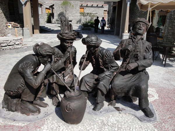 喝咂酒的羌族人雕塑(王铁志摄)