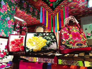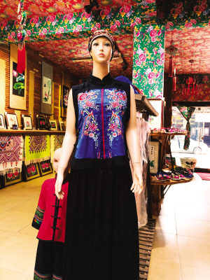 如果说永仁彝绣还保留着许多传统风格的话,那么在楚雄州最有名的民族文化聚集地——彝人古镇上,则展示了更多携带着时尚之风的彝绣产品。