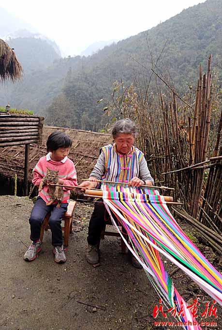 普艳芳跟着奶奶在纺织独龙毯(民族画报和勇 摄影)