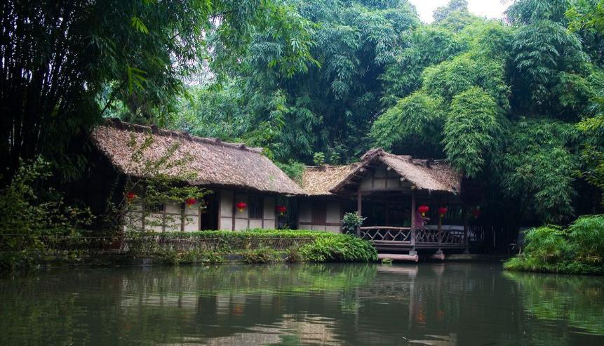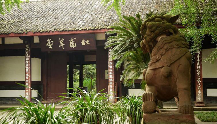 杜甫的诗“万里桥西一草堂,百花潭水即沧浪”(《狂夫》)中提到的便是此处。当时杜甫所建的茅草屋早已随风雨刮打被毁坏了,如今后人为了纪念这段杜甫便在此地修建草堂。