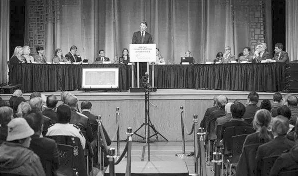 温哥华市长罗伯逊宣读正式道歉声明。 梁森摄