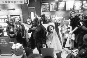 (新闻背景:4月12日,两名黑人在美国费城的一家星巴克店内等朋友时想借用洗手间遭拒,经理发现二人未在店内消费又不肯离开,因而报警。警察赶到后,将二人用手铐逮捕。这一事件引发轩然大波,许多抗议者聚集在涉事门店外,抗议星巴克的种族歧视行为。)