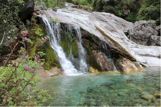 一龙女池、二龙女池落落大方,水浅而且宽敞。过了木桥,沿着楼梯往上爬,三龙女池与四龙女池镶在一座巨壁上,玉带相连、水瀑似带、晶莹璀璨,大家是不是要忍不住停下脚步,细细的聆听水流清澈的声音,深深地吸一口气,定定地看着,看它欢快地蹦过一池又一池,自由自在地奔下山下的洱海;静静的听着,听它忧伤地诉说曾今寂寞的空山。溪水是冰雪融化的,所以清纯;它是苍山孕育的,所以甘甜;它是日月熏陶的,所以有灵性。