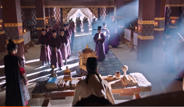 《燕云台》剧中辽景宗耶律贤在夏捺钵中召开南北大臣会议
