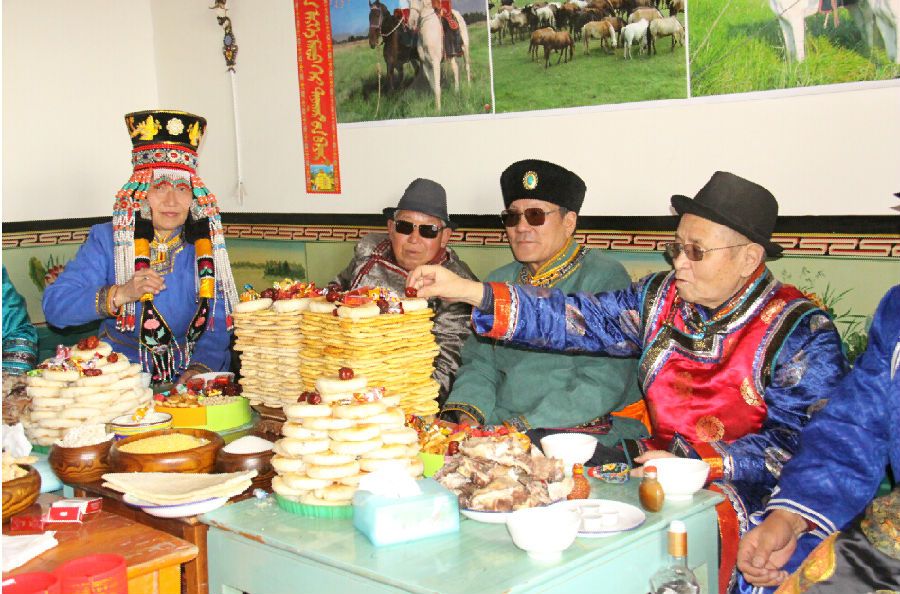 客人就坐后,主家首先敬献“查干伊德”(奶食),以示尊重和欢迎。接着敬茶,这是接待客人必须进行的礼仪性程序。喝茶时要摆放手扒肉、炒米、奶食品、馓子等丰盛的食品。然后举行敬酒仪式,客人能否饮酒,仪式必须完成。用餐时如果要献全羊,还要进行一系列礼仪程序。客人离开时,对长辈要献哈达,并扶上马送行。