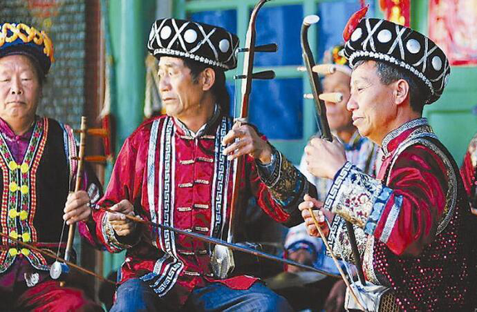 在迤沙拉,时常会听见独具江南丝竹韵味的音乐之声,这是村里的老人们用三弦、笛子、唢呐等民间乐器在演奏古朴清灵、悠扬婉转的谈经古乐。