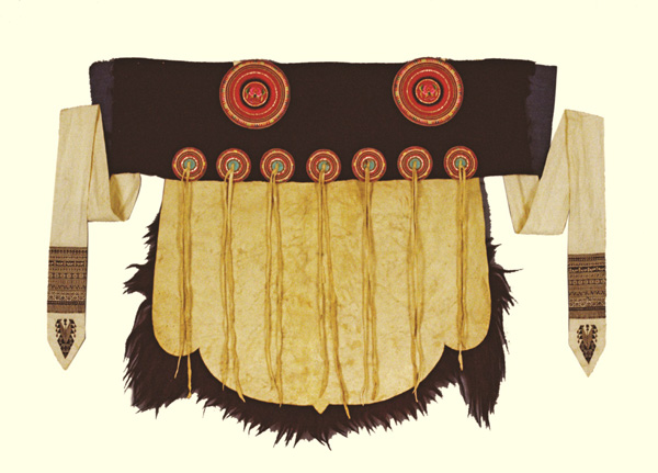 缀绣花圆布盘羊皮女披肩,主要流行于云南省玉龙纳西族自治县和丽江古城一带,是这一地区纳西族妇女的一种传统背饰。其极富民族特色,蕴涵着丰富的文化内涵。